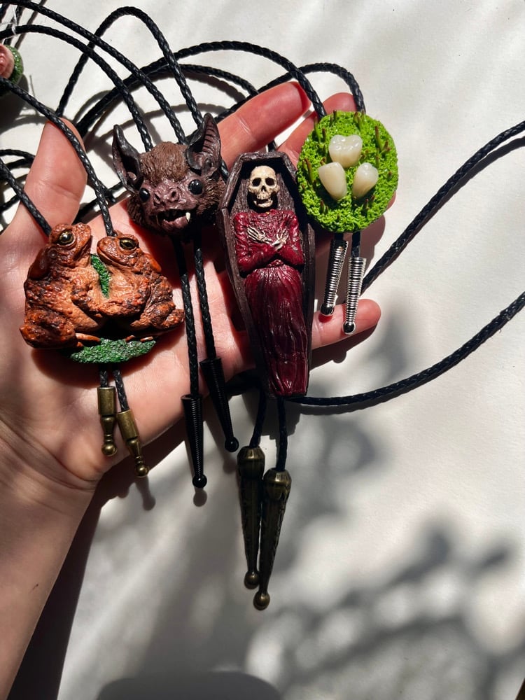 The worms and sets stalks on the tooth bolo are a flexible polymer clay. The teeth are resin.